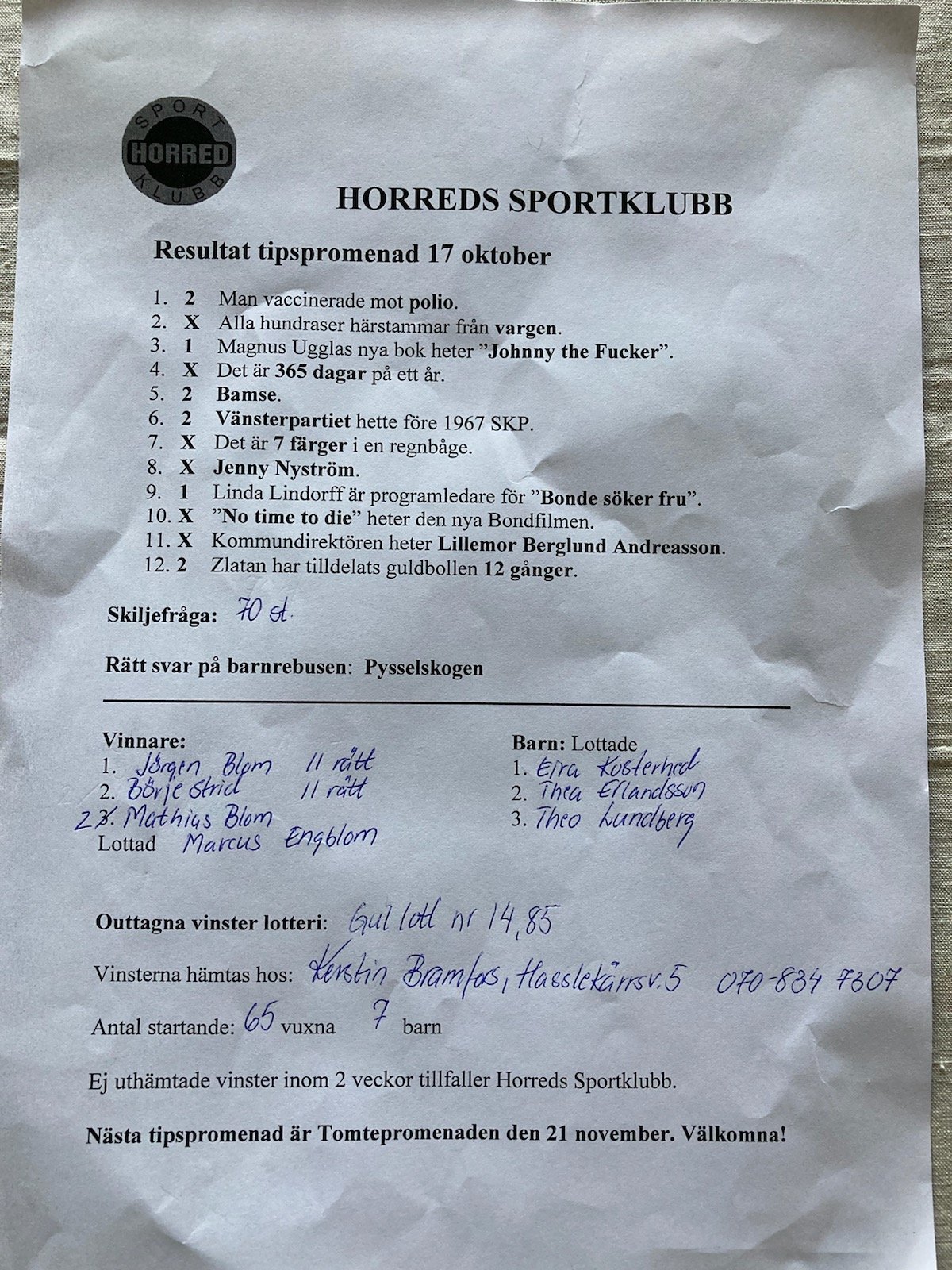 Tipspromenad idag 17 okt vid kilagården. Posted on 17 oktober, 2021 by Jonny Andersson Svara Start mellan 10.00 – 12.30. Våffelkafet är öppet till 13.00 välkomna. Dela inläggetFacebook